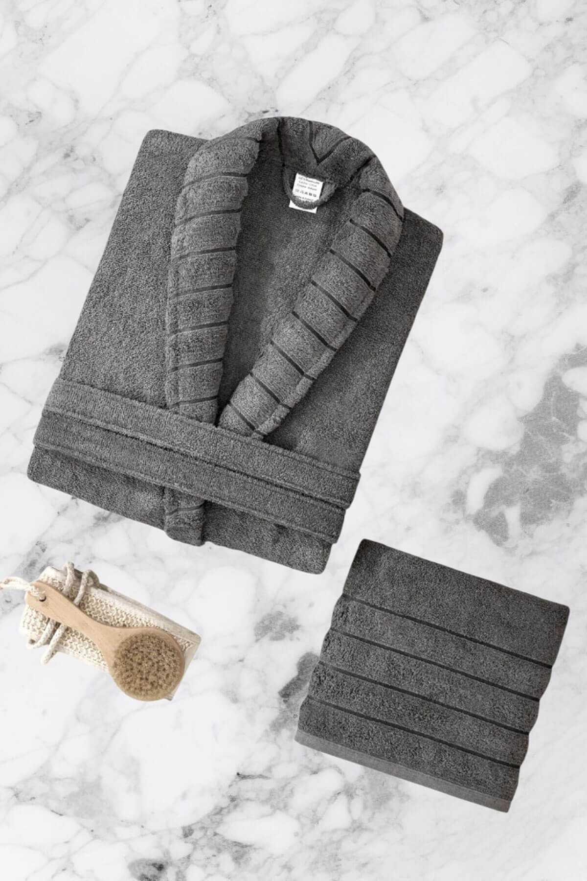 AquaLoom Lüx Erkek Bornoz ve Havlu Seti %100 Pamuklu Antrasit