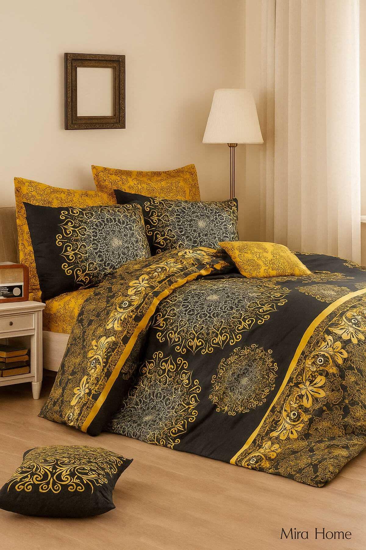 Şıklığı ve gösterişi yatak odanıza taşıyan Mira Home Varaklı Desenli Nevresim Takımı, göz alıcı siyah ve sarı tonlarının zarif birleşiminden oluşuyor. Altın varak desenlerinden ilham alınarak tasarlanan bu özel takım, odanıza lüks ve sofistike bir hava katıyor. %70 pamuk ve %30 polyester kumaşı sayesinde hem yumuşacık bir dokunuş sunar hem de dayanıklılığıyla uzun ömürlü kullanım sağlar.